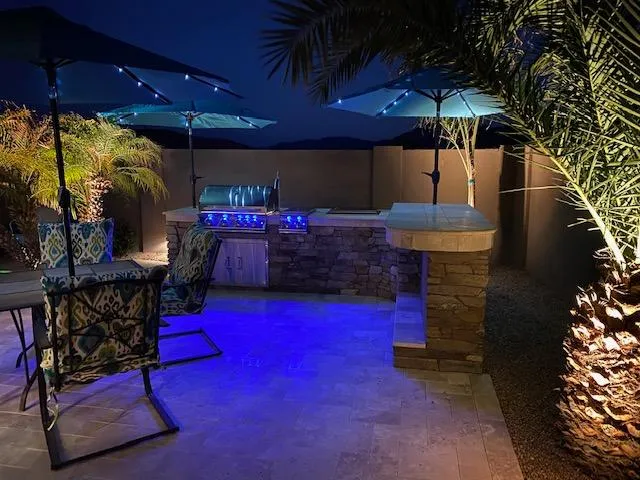 Each kitchen is built with premium stone, granite, or marble finishes to withstand Arizona’s heat. Add-ons like media walls, pergola shade structures, or custom lighting make your outdoor kitchen not only functional, but a true extension of your home.